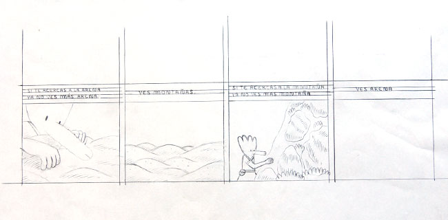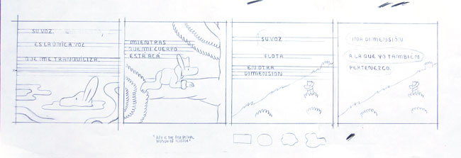 Rascunho da tira da página 79. Embaixo do segundo quadro, está a frase “Art is the perpetual motion of illusion”, que é uma definição de Bob Dylan sobre o que é arte.